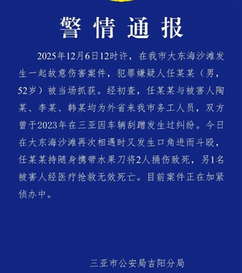 【新唐人北京时间2025年12月06日讯】12月6日,中国海南省三亚市发生凶案,一名男子在该市大东海沙滩刺死3人。