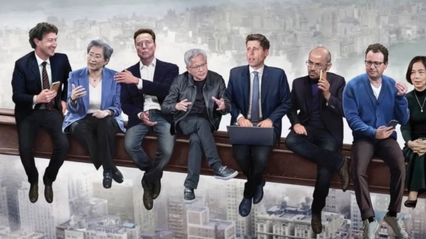 《时代》杂志发布封面图,借用了美国当年兴建帝国大厦时的一张经典照片:一群科技领袖,坐在一根高空钢梁上,包括英伟达CEO黄仁勋、超微半导体CEO苏姿丰,以及世界首富马斯克等人。