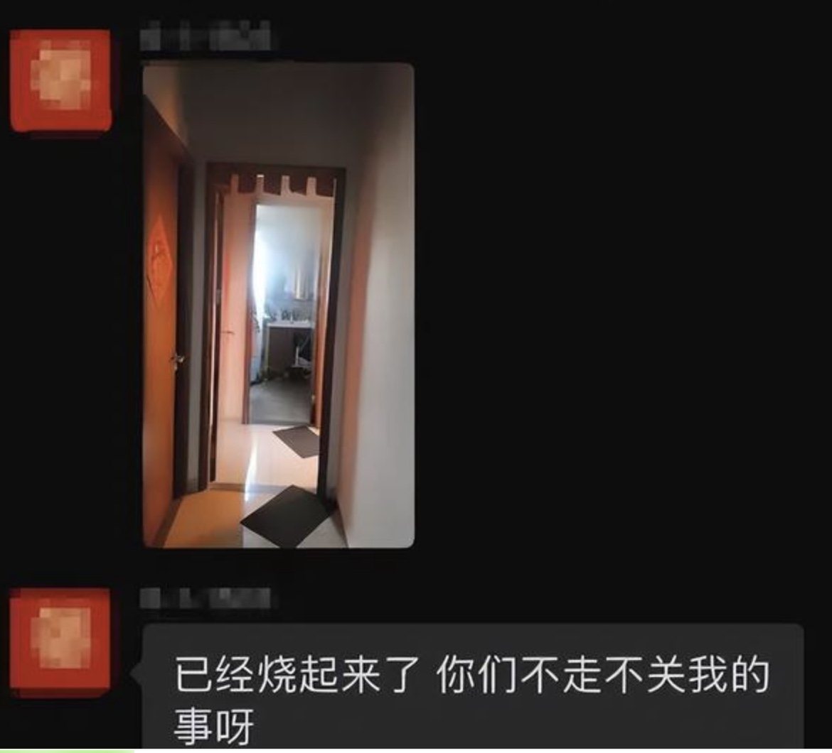 约十分钟后,该住户再次发布一张屋内冒浓烟的图片,并表示“已经烧起来了,你们不走不关我的事”。