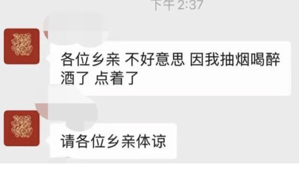 另有聊天记录显示,这名业主还在群里解释,“因我抽烟喝醉酒点着了。”
