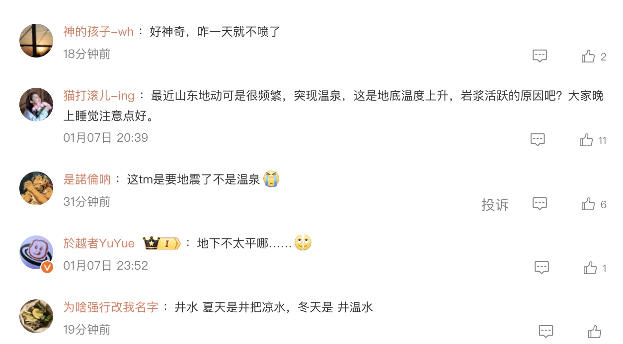 “最近山东地动可是很频繁,突现温泉,这是地底温度上升,岩浆活跃的原因吧?大家晚上睡觉注意点好”“这是要地震了,不是温泉”。