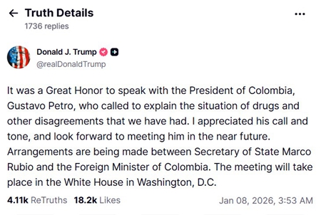 川普1月8日在自家社群平台真实社群(Truth Social)透露,已接获哥伦比亚总统佩特罗(Gustavo Petro)来电,这是川普重返白宫以来,双方首次通话,川普表示:“非常荣幸能与哥伦比亚总统佩特罗通话,电话中他解释了毒品问题以及我们之间存在的其它分歧。我感谢他的来电和语气,并期待在不久的将来与他会面。”