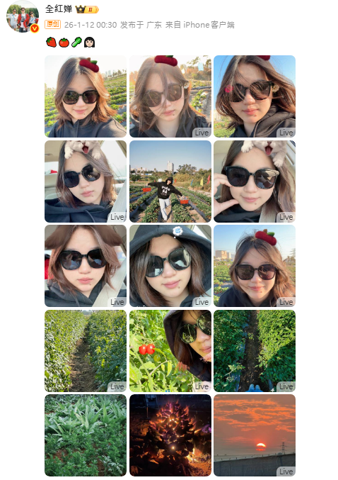 12日凌晨,全红婵在其社交媒体晒出一组去田园采摘草莓、小番茄和蔬菜的照片。当时,她穿了一件黑色的运动帽衫,戴了一副墨镜,手里拎了两个小篮子。在草莓地里,她摆出动作拍照。