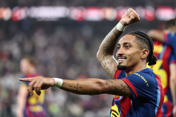 比赛开始后,双方快速进入状态,王马主打边路;巴萨则传控更为流畅,边中结合,向对手施压。第36分钟,费尔明中路分球,巴西前锋拉菲尼亚(Raphinha)带球晃开对手,低射远角,打穿库尔图瓦的“十指关”,为巴萨1:0首开纪录。