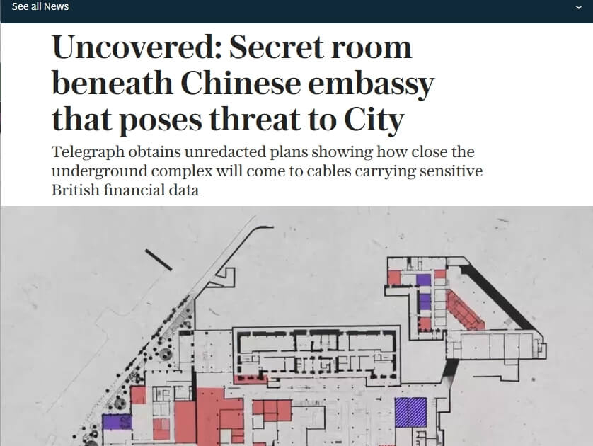 【新唐人北京时间2026年01月13日讯】中(共)国拟在伦敦兴建大规模新使馆,引发使馆恐成为间谍活动和跨境镇压巨型基地疑虑。英国《每日电讯报》周一(1月12日)披露据称是未经遮蔽的使馆设计图,呈现使馆建筑地下不仅有多达208个面积各异的“秘密房间”,其中一个地下深度近3公尺的密室甚至极贴近连通伦敦金融城、传输周边地区数百万网路用户数据的地下光纤电缆。