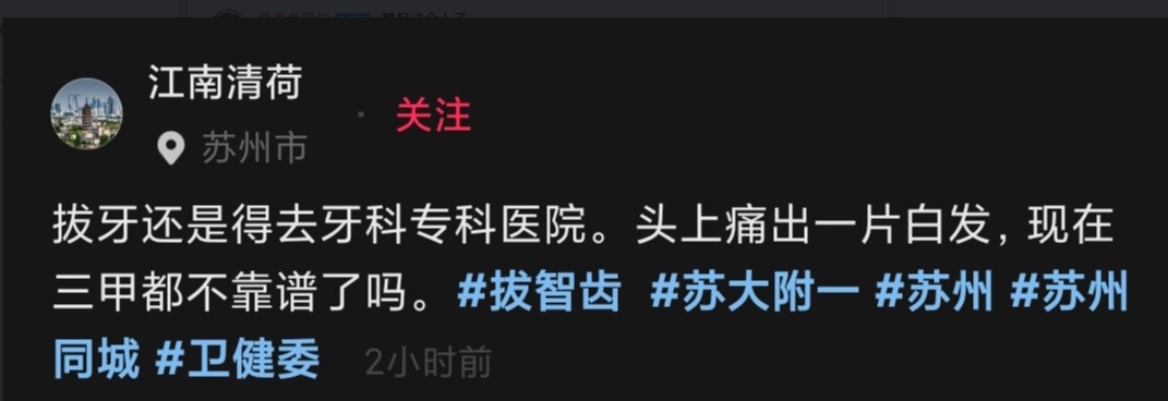 网名为“江南清荷”的男子在视频中介绍,2025年12月10日,他在苏州大学附属第一医院(苏大附一)拔了一颗智齿,缝了几针,然后噩梦开始了,他被疼痛折磨了半个月,每天凌晨3点多被痛醒,消炎药和止痛药吃了好几盒。