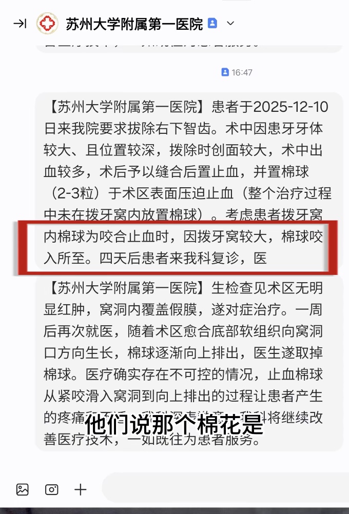 该男子展示苏州大学附属第一医院给他的短信,上面显示,“置棉球于手术表面止血,整个治疗过程中未在拔牙窝内放置棉球,患者拔牙窝内棉球为咬合止血时,因拔牙窝较大,棉球咬入所至”。短信还称,“一周后再次就医,随着手术区愈合底部软组织向窝洞口方向生长,棉球逐渐向上排出,医生遂去掉棉球”。