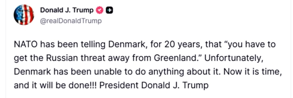 “Based upon a very productive meeting that I have had with the Secretary General of NATO, Mark Rutte, we have formed the framework of a future deal with respect to Greenland and, in fact, the entire Arctic Region. This solution, if consummated, will be a great one for the United… pic.twitter.com/24b99begbb