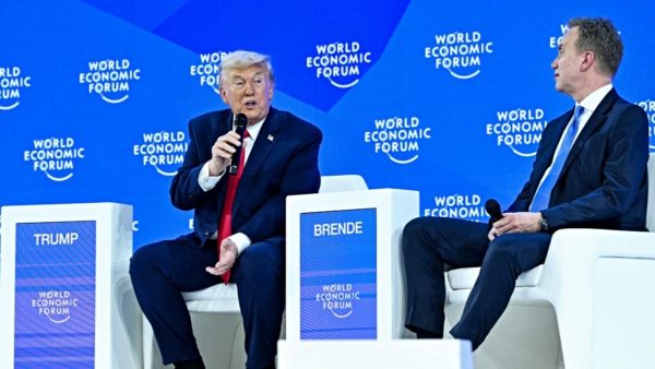【北京时间2026年01月21日22点51分】川普演讲完毕,被邀请与主持人对话。