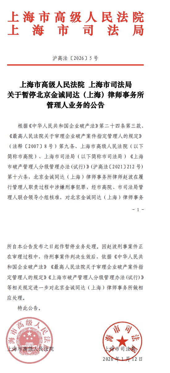 据上海高级法院网站信息,上海高级法院和上海市司法局1月13日联合发布公告,指北京金诚同达(上海)律师事务所律师赵波,在履行管理人职责期间涉嫌刑事犯罪。自公告发布之日起,对其采取暂停业务处理措施。