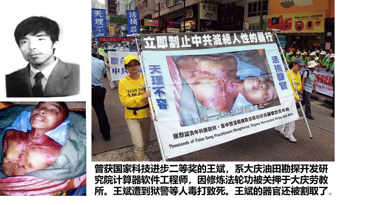 2000年9月,大庆油田勘探开发研究院计算机软件工程师王斌(47岁)因修炼法轮功被关押,在遭狱警和劳教犯人毒打致颈部大动脉断裂、多根肋骨骨折后死亡,其器官随后被割取。