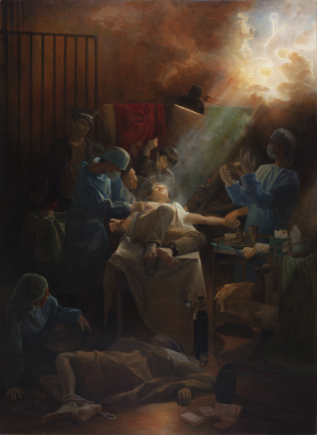 画中修炼人的心灵在神佛的万丈光芒照耀下,印证脚镣铁链控制得了人的身体但拘束不了他的信念。原本应该是救人的手术刀,在共产党邪恶政权中却成为对人的躯体进行迫害的工具。受害年轻人的眼神、纯净的脸庞、抬起的右手,无不传递着画家在画境中至高的关怀、无不触动观画者的心。