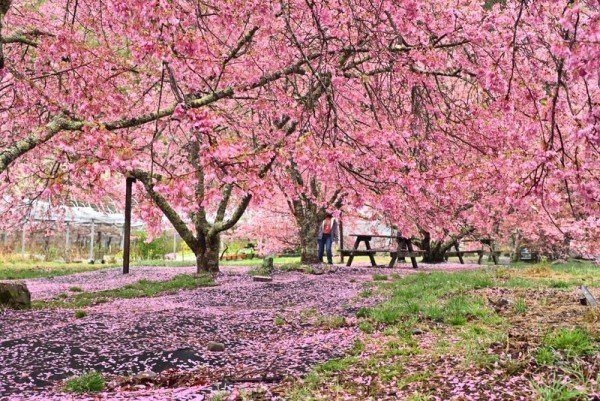 武陵农场说明,目前樱花已呈现满开盛况,比较早开区域已有樱吹雪状况,而晚开樱花品种,在露营区还有不错花况。