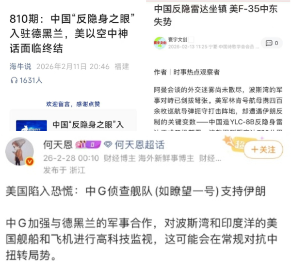 在上个月,中国大陆就有多个自媒体账号宣称,“中国反隐雷达坐镇,美F-35中东失势”、 “中国‘反隐身之眼’入驻德黑兰,美以空中神话终结”、“美国陷入恐慌:中G侦查舰队(如瞭望一号)支持伊朗”。