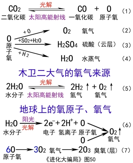 光解这种光化学反应,不可能只发生在金星和木卫二,在地球上也一定存在。上图光解方程(6),不止发生在植物的光合作用中,在植物以外的自然界也有,是大气中的光化学反应。(注意:植物光合作用吸收CO2释放O2,这里的氧气O2并不来源于CO2,而是来源于水H2O!CO2直接被植物吸收、转化、利用了,是水H2O被太阳光能光解,产生氧气O2和H离子,H离子也被植物吸收、利用了。)