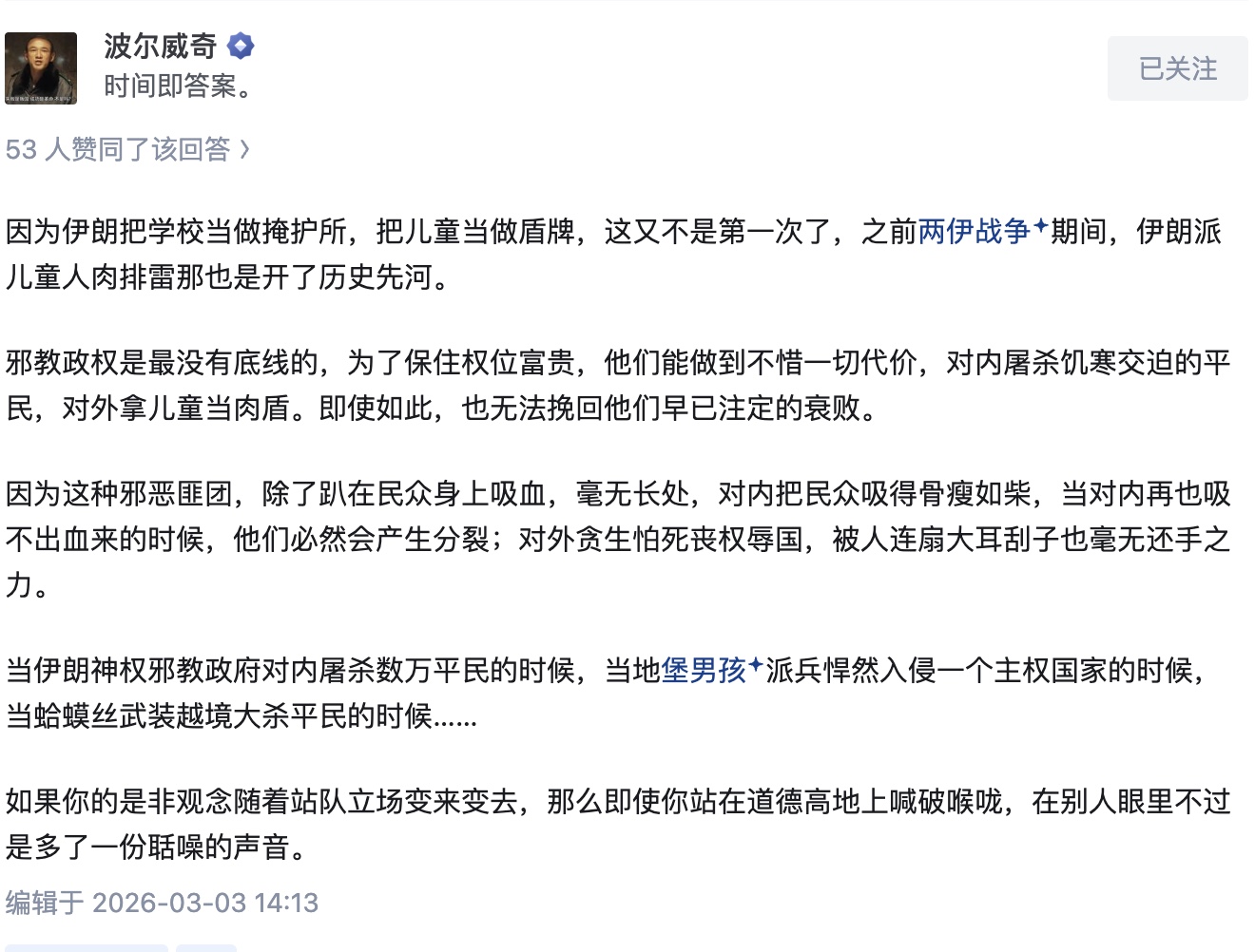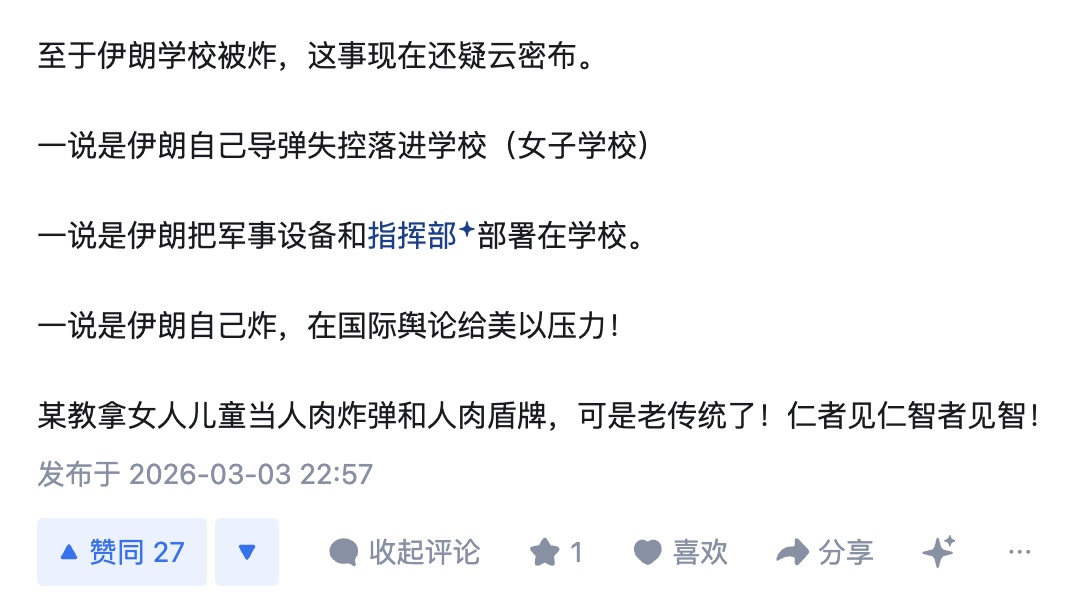 中国大陆网友嘲讽,“今年1月份伊朗断网期间杀了多少平民,里面又有多少是儿童?你为什么不谴责?”“我估计没多少人会去思考为什么伊朗要在重要军事目标周围建学校。将儿童作为盾牌的行为不更应该被谴责吗?”“当年咋不谴责给婴儿奶粉投毒的呢?”“俄罗斯炸乌克兰儿童也没见有啥表示。”