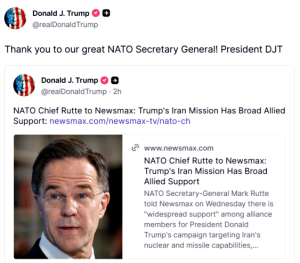 3月5日凌晨,川普总统在其真相社交媒体上转发了该报导,并贴文:“感谢我们伟大的北约秘书长!”