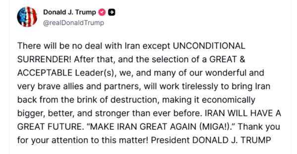 3月6日,美国总统川普在真相社交上贴文:“除了无条件投降,我们不会与伊朗达成任何协议!”