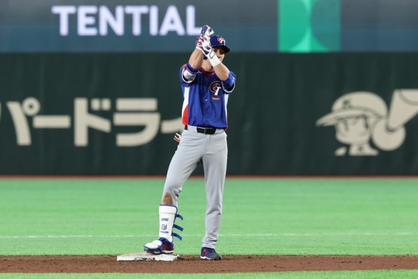 克队交手,6局上,台湾队陈晨威(图)击出二垒安打,一棒2分打点,他在垒上比出庆祝手势。(中央社)