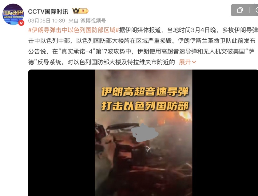 中共央视及多家官媒援引伊朗媒体的报导,声称当地时间3月4日晚,多枚伊朗导弹击中以色列中部,以色列国防部大楼所在区域严重损毁。报导还配以所谓的视频和图片。