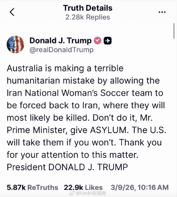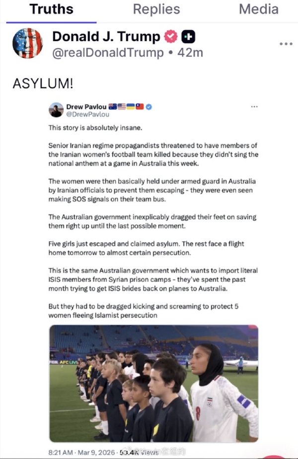 3月9日,美国总统川普发帖,呼吁澳大利亚政府给予庇护,并说,“澳大利亚允许伊朗国家女子足球队被强制送回伊朗,这是一个严重的人道主义错误。在那里,她们很可能会被杀害。不要这么做,总理先生。给她们 庇护(ASYLUM)。如果你们不愿意,美国会接纳她们。”