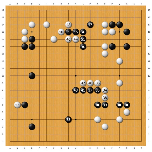 本局,杨子萱猜中黑棋先行,序盘在左下角构筑起大模样。藤泽里菜经验颇为老到,白40、42在中腹连压两手,一方面巩固自己棋形,另一方面切断上方与右边两块黑棋的联络,使对手因孤子而难以发力。在经过一番铺垫后,白52托,深入敌阵破空。