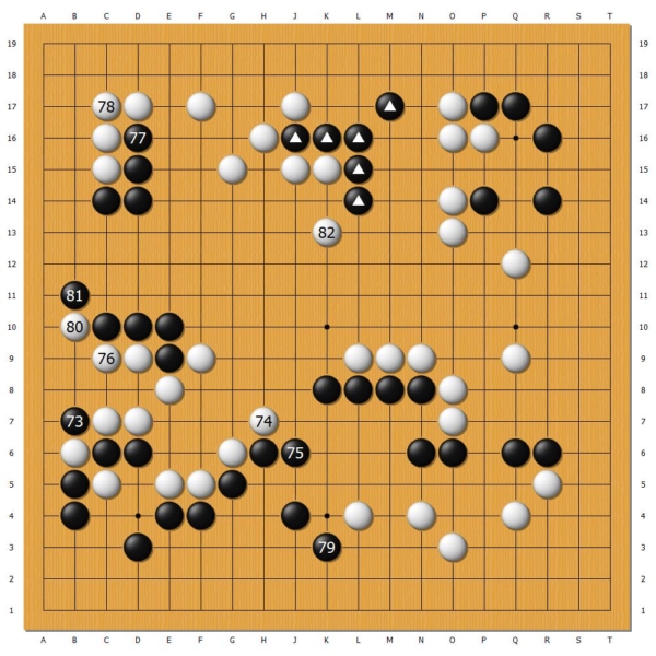 实战,杨子萱完全跟着对手步调走,无从发挥。黑棋在攻击中不仅被白棋轻松活出,而且局部落下后手。白82跳,抢攻黑上方孤子,牢牢掌控局势。