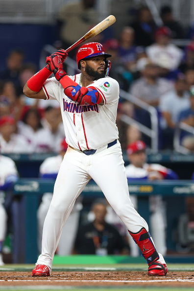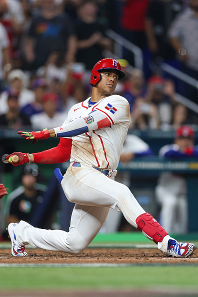 2026年3月13日:在2026年世界棒球经典赛四分之一决赛对阵韩国队的比赛中,多明尼加共和国队22号球员索托在第三局挥棒击球。(Al Bello/Getty Images)