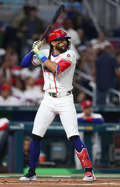2026年3月13日:在2026年世界棒球经典赛四分之一决赛对阵韩国队的比赛中,多明尼加共和国队27号球员小葛雷诺(Vladimir Guerrero Jr.)在第二局击球。(Al Bello/Getty Images)