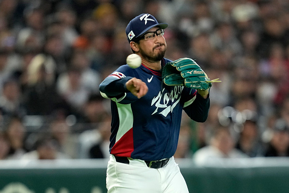 图为2026年3月9日,在2026年世界棒球经典赛C组韩国对阵澳大利亚的比赛中,韩国队33号球员邓宁在第七局接住内野安打后传球。示意图。(Toru Hanai/Getty Images)