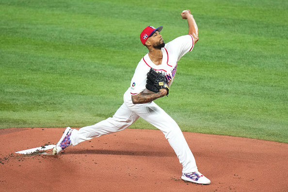 2026年3月13日:在2026年世界棒球经典赛四分之一决赛对阵韩国队的比赛中,多明尼加共和国队61号球员桑杰士(Cristopher Sánchez)在第一局投球。(Rich Storry/Getty Images)