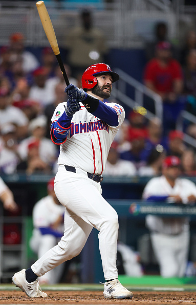 2026年3月13日:在2026年世界棒球经典赛四分之一决赛中,多明尼加共和国队28号球员威尔斯在第七局下半击出一记三分全垒打,帮助球队战胜韩国队。(Al Bello/Getty Images)