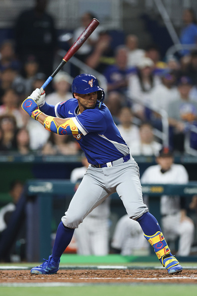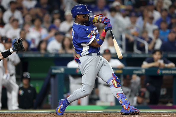 2026年3月14日,委内瑞拉队14号球员托瓦在2026年世界棒球经典赛第三局对阵日本队的比赛中击球。(Al Bello/Getty Images)