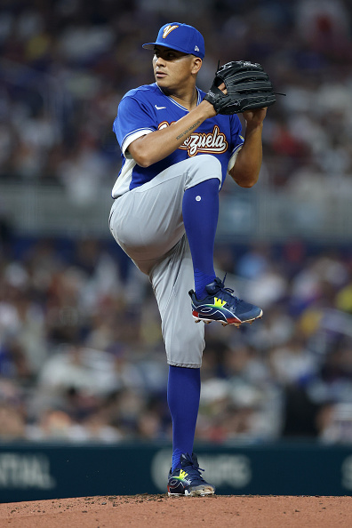 2026年3月14日,委内瑞拉队55号球员兰格·苏亚雷斯在2026年世界棒球经典赛首局对阵日本队,比赛于2026年3月14日在佛罗里达州迈阿密的loanDepot公园举行。(Al Bello/Getty Images)