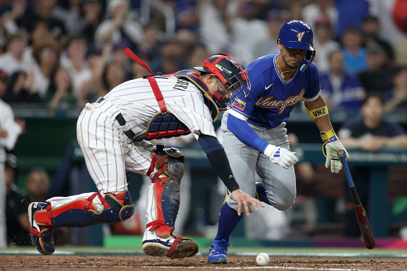2026年3月14日,在2026年世界棒球经典赛第三局比赛中,委内瑞拉队14号球员托尔被日本队4号球员若月贤也触杀出局。(Al Bello/Getty Images)