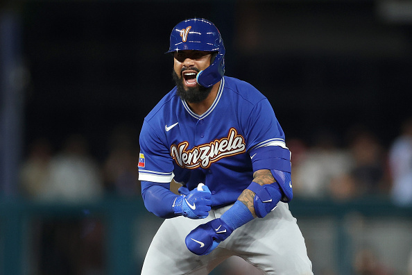 2026年3月14日,在2026年世界棒球经典赛上,委内瑞拉队25号球员格雷伯·托雷斯在对阵日本队的比赛中击出二垒安打后做出庆祝动作。(Al Bello/Getty Images)