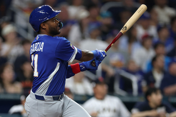 2026年3月14日,在2026年世界棒球经典赛于佛罗里达州迈阿密loanDepot公园举行的比赛中,委内瑞拉队11号球员迈克尔·加西亚在第五局击出本垒打,对手是日本队。(Al Bello/Getty Images)