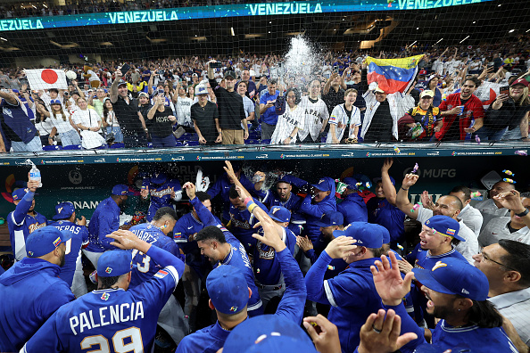 2026年3月14日,在2026年世界棒球经典赛上,委内瑞拉队以8比5击败日本队后庆祝胜利。比赛于2026年3月14日在佛罗里达州迈阿密的loanDepot公园举行。(Al Bello/Getty Images)