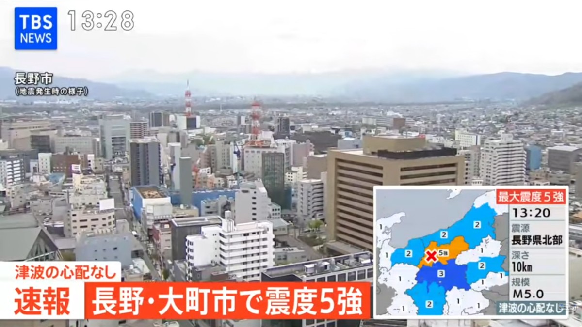 日本TBS电视台与日本放送协会(NHK)报导,长野县北部今天下午1时20分许(台北时间中午12时20分)发生推估规模5.0的地震,大町市观测到最大震度5强。周边地区也观测到震度1到3不等的摇晃。