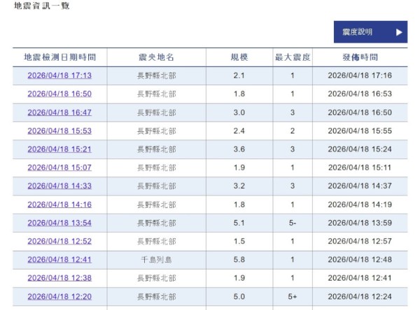 【新唐人北京时间2026年04月18日讯】日本长野县今天(4月18日)稍早接连发生地震,长野县大町市观测到最大震度5强。气象厅指出,“震央附近有活断层带,若发生大地震,可能会出现震度6强以上的摇晃”,呼吁民众留意。