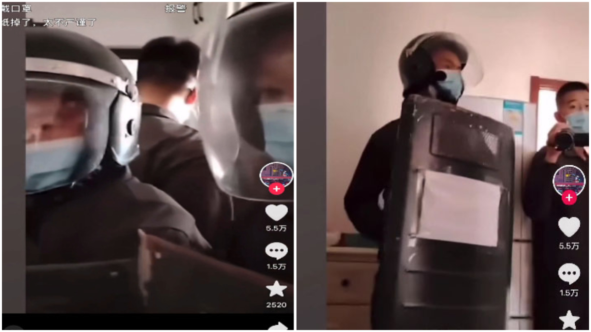 4月17日,北京传出一段视频显示,一大群手持盾牌的武警,强行闯入一名住户家中。还有其他黑衣人在屋内翻箱倒柜地搜查。这些人都戴着口罩,掩饰容貌。并且大部分武警手中的盾牌,都用A4白纸盖住了“武警”字样。
