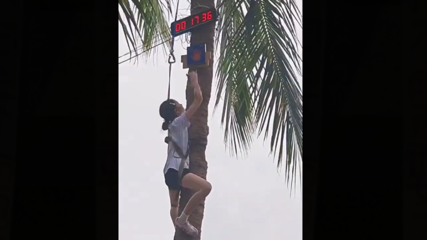 网传的视频显示,这名16岁的女生来到椰树前,随着一声令下,她开始攀爬。她手脚并用,双腿紧紧夹住树身,动作敏捷、干脆利落,从地面到树顶,用了17秒多。现场同学不断高喊“加油!加油!”(点击观看相关视频)而在男子组比赛中,一名男生不到10秒就登顶。