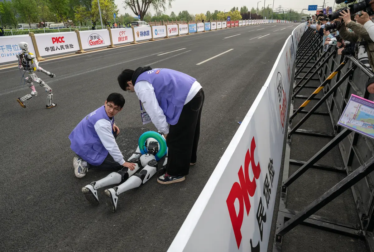 2026年4月19日,北京亦庄人形机器人半程马拉松比赛中,一个人形机器人摔倒,工作人员在试图救援。(Kevin Frayer/Getty Images)