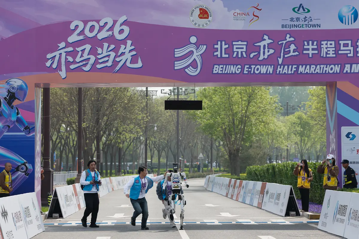 2026年4月19日,北京亦庄人形机器人半程马拉松比赛中,一个人形机器人刚刚通过终点线,工作人员立刻上前将其拉住。(Lintao Zhang/Getty Images)