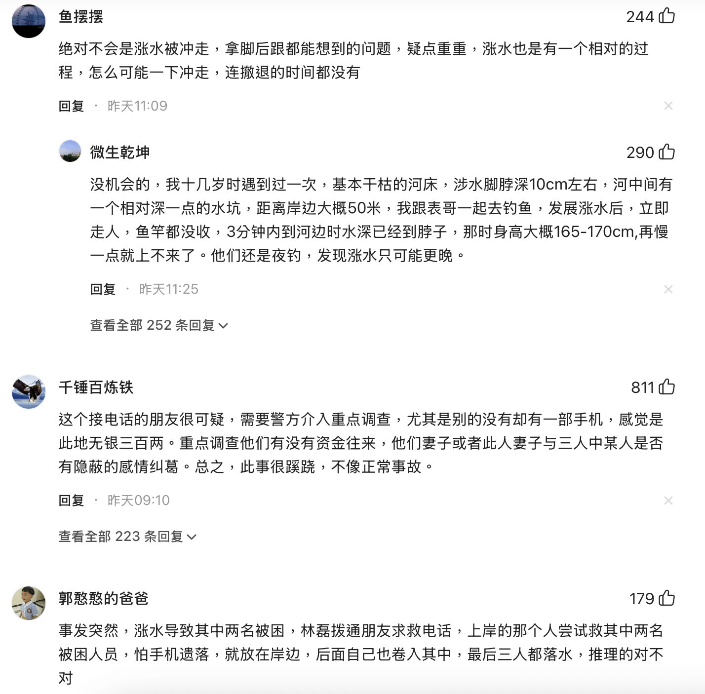 晚上8点多,她见下起了雨,给儿子打电话,想让他早点回家,但是电话没打通。随后,林磊的朋友来电,说林磊突然遇到涨水,难以脱身,让朋友去救他们。
