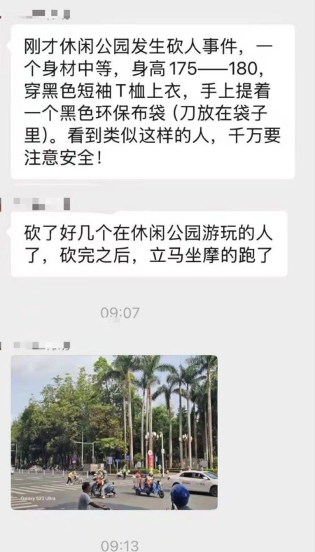 一聊天截图里网友写道:“刚才休闲公园发生砍人事件,(凶手是)一个身材中等(的人),身高175—180(厘米),穿黑色短袖T恤上衣,手上提着一个黑色环保布袋(刀放在袋子里)。看到类似这样的人,千万要注意安全!砍了好几个在休闲公园游玩的人,砍完之后立马坐摩的跑了。”