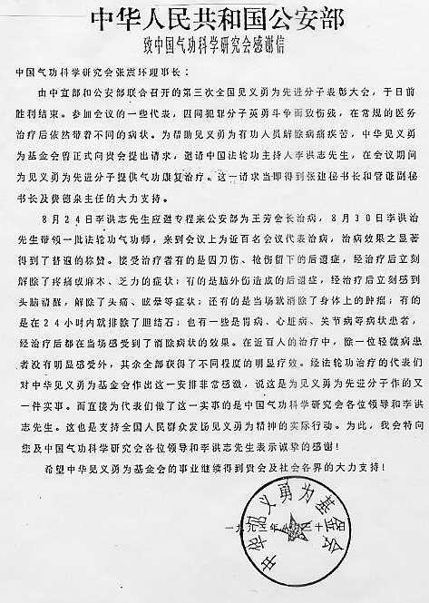 1993年8月,中宣部和公安部联合召开第三次全国见义勇为先进分子表彰大会,专门邀请李洪志先生为与会的公安英模做免费康复治疗。为此,公安部所属中华见义勇为基金会在8月31日发出《中华人民共和国公安部致中国气功科学研究会感谢信》,对李洪志先生及法轮功的神奇祛病健身功效进行了高度肯定。