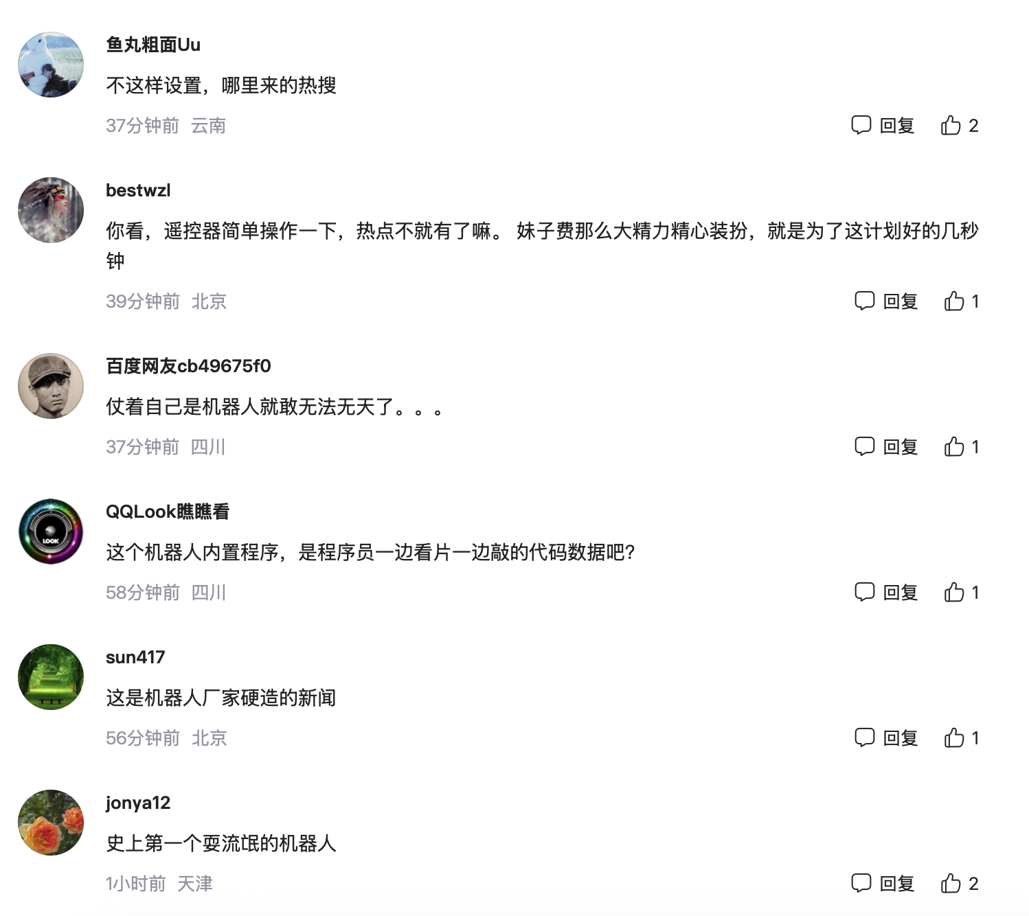 “这是一个流氓机器人!”“背后遥控,突然变态。”“机器人失控,太可怕了。”“聪明人的剧本而已。一切为了流量。”