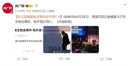 4月26日,“白宫晚宴枪击事件枪手身亡”的词条,冲上微博热搜第一,内容是中共央视新闻报导的一句话新闻,称“当地时间4月25日,美国白宫记者晚宴大厅发生枪击事件,枪手现已身亡”。