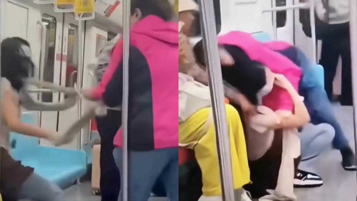 网传的视频显示,一名穿桃红色外套的女子和一名穿短袖的年轻女子在车厢内发生激烈肢体冲突,你拉我扯,一来一往,互不相让,从椅子上一直打到地上,互相扭打,引来车上乘客围观,现场一片混乱。